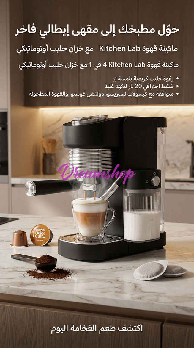 | Machine à Café 4 en 1 Kitchen Lab KT-CM-002 – Avec Réservoir de Lait Automatique – 20 Bars – 1.1L |