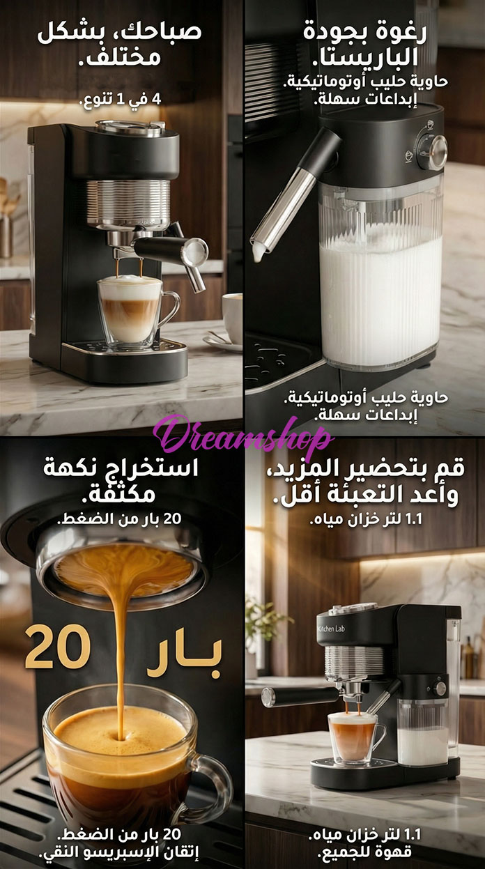 - ضغط احترافي : مضخة بقوة 20 بار لاستخلاص نكهة القهوة الحقيقية مع طبقة كريمية مثالية.